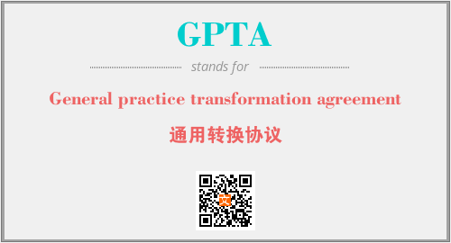 英文缩略词“GPTA”经常作为“General practice transformation agreement”的英文缩写来使用,中文表示:“通用转换协议”。本文将详细介绍英文缩写词GPTA所代表英文单词,其对应的中文拼音、详细解释以及在英语中的流行度。此外,还有关于缩略词GPTA的分类、应用领域及相关应用示例等。
