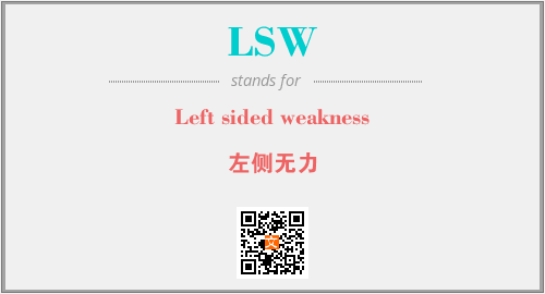 英文缩略词“LSW”经常作为“Left sided weakness”的英文缩写来使用,中文表示:“左侧无力”。本文将详细介绍英文缩写词LSW所代表英文单词,其对应的中文拼音、详细解释以及在英语中的流行度。此外,还有关于缩略词LSW的分类、应用领域及相关应用示例等。