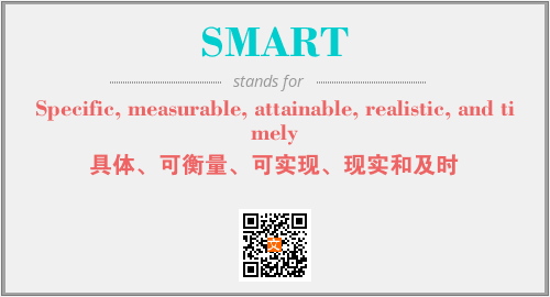 上述内容是“Specific, measurable, attainable, realistic, and timely”作为“SMART”的缩写,解释为“具体、可衡量、可实现、现实和及时”时的信息,以及英文缩略词SMART所代表的英文单词,其对应的中文拼音、详细解释以及在英文中的流行度和相关分类、应用领域及应用示例等。