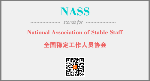 上述内容是“National Association of Stable Staff”作为“NASS”的缩写,解释为“全国稳定工作人员协会”时的信息,以及英文缩略词NASS所代表的英文单词,其对应的中文拼音、详细解释以及在英文中的流行度和相关分类、应用领域及应用示例等。
