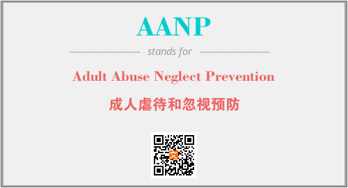 英文缩略词“AANP”经常作为“Adult Abuse Neglect Prevention”的英文缩写来使用,中文表示:“成人虐待和忽视预防”。本文将详细介绍英文缩写词AANP所代表英文单词,其对应的中文拼音、详细解释以及在英语中的流行度。此外,还有关于缩略词AANP的分类、应用领域及相关应用示例等。