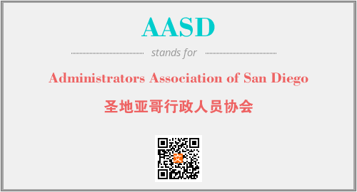上述内容是“Administrators Association of San Diego”作为“AASD”的缩写,解释为“圣地亚哥行政人员协会”时的信息,以及英文缩略词AASD所代表的英文单词,其对应的中文拼音、详细解释以及在英文中的流行度和相关分类、应用领域及应用示例等。