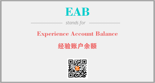 上述内容是“Experience Account Balance”作为“EAB”的缩写,解释为“经验账户余额”时的信息,以及英文缩略词EAB所代表的英文单词,其对应的中文拼音、详细解释以及在英文中的流行度和相关分类、应用领域及应用示例等。
