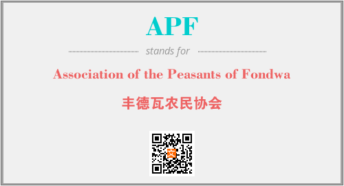 上述内容是“Association of the Peasants of Fondwa”作为“APF”的缩写,解释为“丰德瓦农民协会”时的信息,以及英文缩略词APF所代表的英文单词,其对应的中文拼音、详细解释以及在英文中的流行度和相关分类、应用领域及应用示例等。
