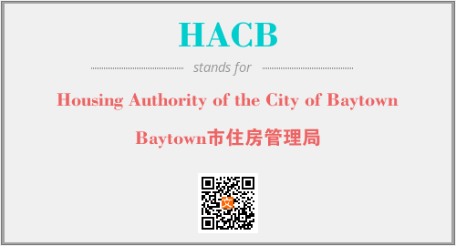上述内容是“Housing Authority of the City of Baytown”作为“HACB”的缩写,解释为“Baytown市住房管理局”时的信息,以及英文缩略词HACB所代表的英文单词,其对应的中文拼音、详细解释以及在英文中的流行度和相关分类、应用领域及应用示例等。