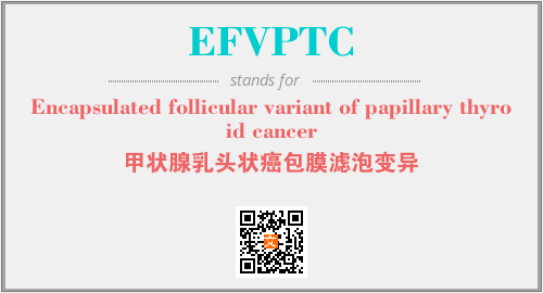 英文缩略词“EFVPTC”经常作为“Encapsulated follicular variant of papillary thyroid cancer”的英文缩写来使用,中文表示:“甲状腺乳头状癌包膜滤泡变异”。本文将详细介绍英文缩写词EFVPTC所代表英文单词,其对应的中文拼音、详细解释以及在英语中的流行度。此外,还有关于缩略词EFVPTC的分类、应用领域及相关应用示例等。