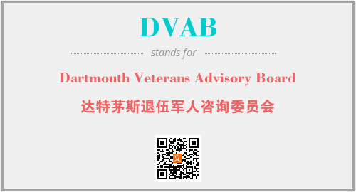 上述内容是“Dartmouth Veterans Advisory Board”作为“DVAB”的缩写,解释为“达特茅斯退伍军人咨询委员会”时的信息,以及英文缩略词DVAB所代表的英文单词,其对应的中文拼音、详细解释以及在英文中的流行度和相关分类、应用领域及应用示例等。