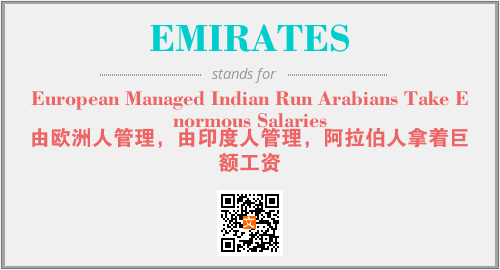上述内容是“European Managed Indian Run Arabians Take Enormous Salaries”作为“EMIRATES”的缩写,解释为“由欧洲人管理,由印度人管理,阿拉伯人拿着巨额工资”时的信息,以及英文缩略词EMIRATES所代表的英文单词,其对应的中文拼音、详细解释以及在英文中的流行度和相关分类、应用领域及应用示例等。