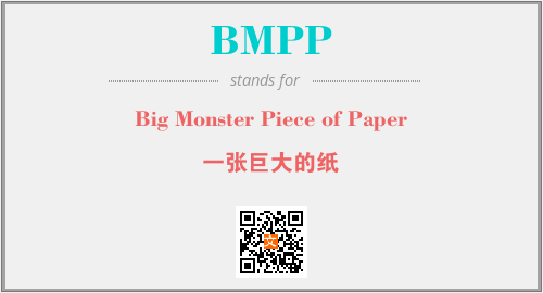 英文缩略词“BMPP”经常作为“Big Monster Piece of Paper”的英文缩写来使用,中文表示:“一张巨大的纸”。本文将详细介绍英文缩写词BMPP所代表英文单词,其对应的中文拼音、详细解释以及在英语中的流行度。此外,还有关于缩略词BMPP的分类、应用领域及相关应用示例等。