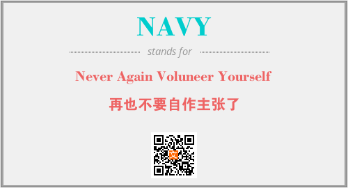 以上为Never Again Voluneer Yourself英文缩略词NAVY的中文解释,以及该英文缩写在英语的流行度、分类和应用领域方面的信息。