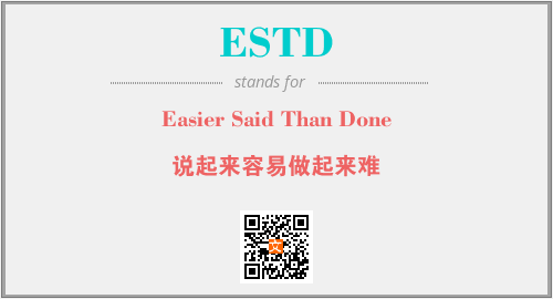 上述内容是“Easier Said Than Done”作为“ESTD”的缩写,解释为“说起来容易做起来难”时的信息,以及英文缩略词ESTD所代表的英文单词,其对应的中文拼音、详细解释以及在英文中的流行度和相关分类、应用领域及应用示例等。