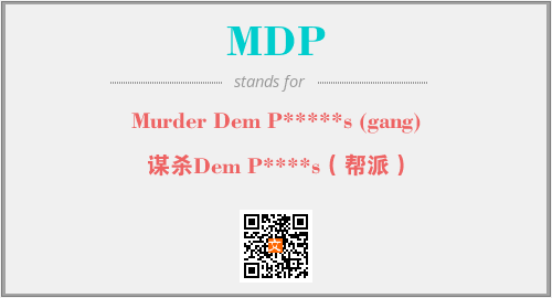 英文缩略词“MDP”经常作为“Murder Dem P*****s (gang)”的英文缩写来使用,中文表示:“谋杀Dem P****s(帮派)”。本文将详细介绍英文缩写词MDP所代表英文单词,其对应的中文拼音、详细解释以及在英语中的流行度。此外,还有关于缩略词MDP的分类、应用领域及相关应用示例等。