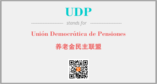 上述内容是“Unión Democrática de Pensiones”作为“UDP”的缩写,解释为“养老金民主联盟”时的信息,以及英文缩略词UDP所代表的英文单词,其对应的中文拼音、详细解释以及在英文中的流行度和相关分类、应用领域及应用示例等。