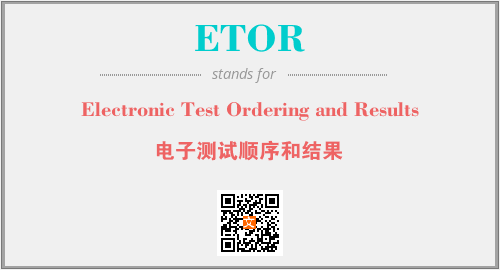 英文缩略词“ETOR”经常作为“Electronic Test Ordering and Results”的英文缩写来使用,中文表示:“电子测试顺序和结果”。本文将详细介绍英文缩写词ETOR所代表英文单词,其对应的中文拼音、详细解释以及在英语中的流行度。此外,还有关于缩略词ETOR的分类、应用领域及相关应用示例等。