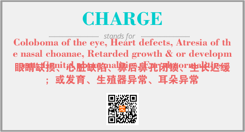 英文缩略词“CHARGE”经常作为“Coloboma of the eye, Heart defects, Atresia of the nasal choanae, Retarded growth & or development, Genital abnormalities, Ear abnormalities”的英文缩写来使用,中文表示:“眼睛缺损、心脏缺陷、鼻后鼻孔闭锁、生长迟缓;或发育、生殖器异常、耳朵异常”。本文将详细介绍英文缩写词CHARGE所代表英文单词,其对应的中文拼音、详细解释以及在英语中的流行度。此外,还有关于缩略词CHARGE的分类、应用领域及相关应用示例等。