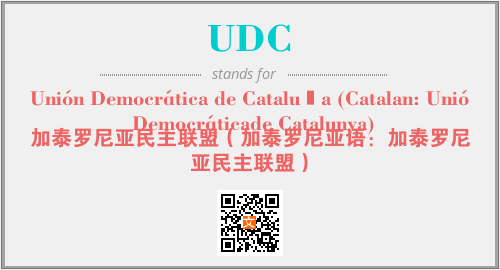 上述内容是“Unión Democrática de Cataluña (Catalan: Unió Democráticade Catalunya)”作为“UDC”的缩写,解释为“加泰罗尼亚民主联盟(加泰罗尼亚语:加泰罗尼亚民主联盟)”时的信息,以及英文缩略词UDC所代表的英文单词,其对应的中文拼音、详细解释以及在英文中的流行度和相关分类、应用领域及应用示例等。