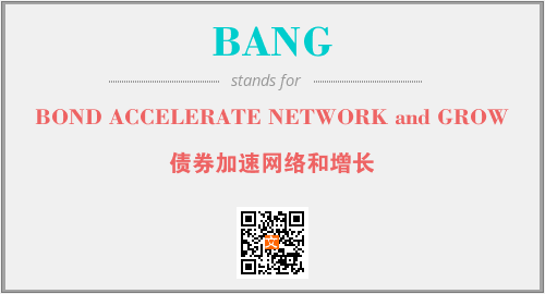 上述内容是“BOND ACCELERATE NETWORK and GROW”作为“BANG”的缩写,解释为“债券加速网络和增长”时的信息,以及英文缩略词BANG所代表的英文单词,其对应的中文拼音、详细解释以及在英文中的流行度和相关分类、应用领域及应用示例等。