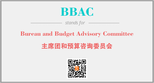 上述内容是“Bureau and Budget Advisory Committee”作为“BBAC”的缩写,解释为“主席团和预算咨询委员会”时的信息,以及英文缩略词BBAC所代表的英文单词,其对应的中文拼音、详细解释以及在英文中的流行度和相关分类、应用领域及应用示例等。