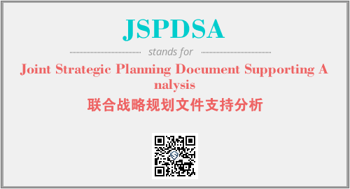 英文缩略词“JSPDSA”经常作为“Joint Strategic Planning Document Supporting Analysis”的英文缩写来使用,中文表示:“联合战略规划文件支持分析”。本文将详细介绍英文缩写词JSPDSA所代表英文单词,其对应的中文拼音、详细解释以及在英语中的流行度。此外,还有关于缩略词JSPDSA的分类、应用领域及相关应用示例等。