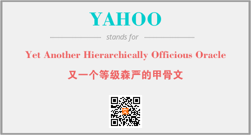 上述内容是“Yet Another Hierarchically Officious Oracle”作为“YAHOO”的缩写,解释为“又一个等级森严的甲骨文”时的信息,以及英文缩略词YAHOO所代表的英文单词,其对应的中文拼音、详细解释以及在英文中的流行度和相关分类、应用领域及应用示例等。