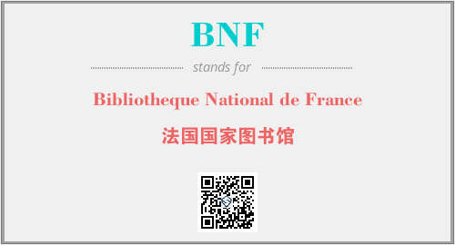 上述内容是“Bibliotheque National de France”作为“BNF”的缩写,解释为“法国国家图书馆”时的信息,以及英文缩略词BNF所代表的英文单词,其对应的中文拼音、详细解释以及在英文中的流行度和相关分类、应用领域及应用示例等。