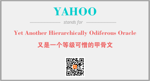 上述内容是“Yet Another Hierarchically Odiferous Oracle”作为“YAHOO”的缩写,解释为“又是一个等级可憎的甲骨文”时的信息,以及英文缩略词YAHOO所代表的英文单词,其对应的中文拼音、详细解释以及在英文中的流行度和相关分类、应用领域及应用示例等。
