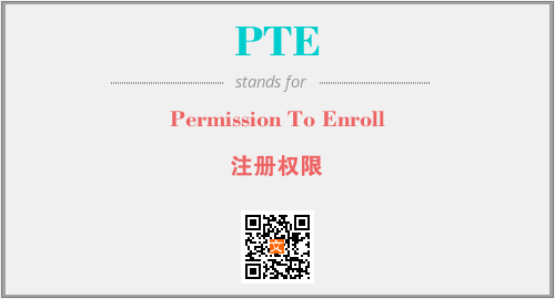 英文缩略词“PTE”经常作为“Permission To Enroll”的英文缩写来使用,中文表示:“注册权限”。本文将详细介绍英文缩写词PTE所代表英文单词,其对应的中文拼音、详细解释以及在英语中的流行度。此外,还有关于缩略词PTE的分类、应用领域及相关应用示例等。