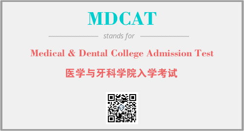 英文缩略词“MDCAT”经常作为“Medical & Dental College Admission Test”的英文缩写来使用,中文表示:“医学与牙科学院入学考试”。本文将详细介绍英文缩写词MDCAT所代表英文单词,其对应的中文拼音、详细解释以及在英语中的流行度。此外,还有关于缩略词MDCAT的分类、应用领域及相关应用示例等。