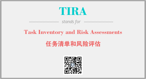 上述内容是“Task Inventory and Risk Assessments”作为“TIRA”的缩写,解释为“任务清单和风险评估”时的信息,以及英文缩略词TIRA所代表的英文单词,其对应的中文拼音、详细解释以及在英文中的流行度和相关分类、应用领域及应用示例等。