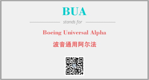 上述内容是“Boeing Universal Alpha”作为“BUA”的缩写,解释为“波音通用阿尔法”时的信息,以及英文缩略词BUA所代表的英文单词,其对应的中文拼音、详细解释以及在英文中的流行度和相关分类、应用领域及应用示例等。