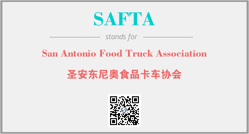 上述内容是“San Antonio Food Truck Association”作为“SAFTA”的缩写,解释为“圣安东尼奥食品卡车协会”时的信息,以及英文缩略词SAFTA所代表的英文单词,其对应的中文拼音、详细解释以及在英文中的流行度和相关分类、应用领域及应用示例等。