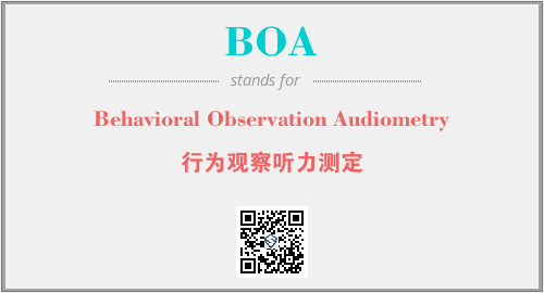 英文缩略词“BOA”经常作为“Behavioral Observation Audiometry”的英文缩写来使用,中文表示:“行为观察听力测定”。本文将详细介绍英文缩写词BOA所代表英文单词,其对应的中文拼音、详细解释以及在英语中的流行度。此外,还有关于缩略词BOA的分类、应用领域及相关应用示例等。