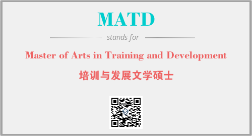 上述内容是“Master of Arts in Training and Development”作为“MATD”的缩写,解释为“培训与发展文学硕士”时的信息,以及英文缩略词MATD所代表的英文单词,其对应的中文拼音、详细解释以及在英文中的流行度和相关分类、应用领域及应用示例等。