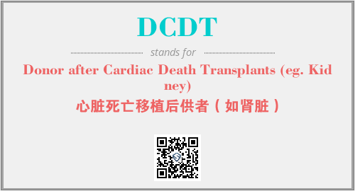 上述内容是“Donor after Cardiac Death Transplants (eg. Kidney)”作为“DCDT”的缩写,解释为“心脏死亡移植后供者(如肾脏)”时的信息,以及英文缩略词DCDT所代表的英文单词,其对应的中文拼音、详细解释以及在英文中的流行度和相关分类、应用领域及应用示例等。