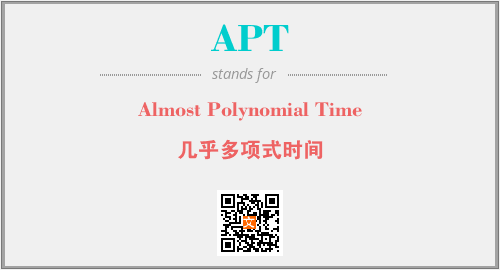 上述内容是“Almost Polynomial Time”作为“APT”的缩写,解释为“几乎多项式时间”时的信息,以及英文缩略词APT所代表的英文单词,其对应的中文拼音、详细解释以及在英文中的流行度和相关分类、应用领域及应用示例等。