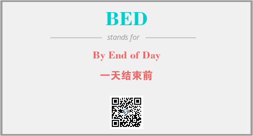 英文缩略词“BED”经常作为“By End of Day”的英文缩写来使用,中文表示:“一天结束前”。本文将详细介绍英文缩写词BED所代表英文单词,其对应的中文拼音、详细解释以及在英语中的流行度。此外,还有关于缩略词BED的分类、应用领域及相关应用示例等。