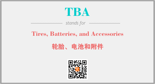 上述内容是“Tires, Batteries, and Accessories”作为“TBA”的缩写,解释为“轮胎、电池和附件”时的信息,以及英文缩略词TBA所代表的英文单词,其对应的中文拼音、详细解释以及在英文中的流行度和相关分类、应用领域及应用示例等。