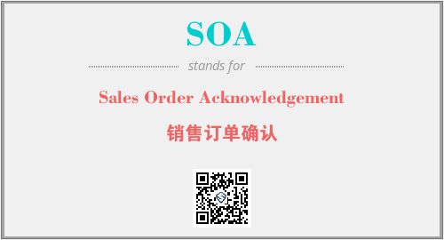 英文缩略词“SOA”经常作为“Sales Order Acknowledgement”的英文缩写来使用,中文表示:“销售订单确认”。本文将详细介绍英文缩写词SOA所代表英文单词,其对应的中文拼音、详细解释以及在英语中的流行度。此外,还有关于缩略词SOA的分类、应用领域及相关应用示例等。
