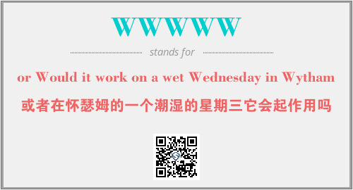 以上为or Would it work on a wet Wednesday in Wytham英文缩略词WWWWW的中文解释,以及该英文缩写在英语的流行度、分类和应用领域方面的信息。