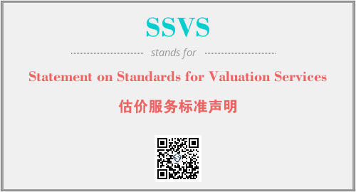 上述内容是“Statement on Standards for Valuation Services”作为“SSVS”的缩写,解释为“估价服务标准声明”时的信息,以及英文缩略词SSVS所代表的英文单词,其对应的中文拼音、详细解释以及在英文中的流行度和相关分类、应用领域及应用示例等。