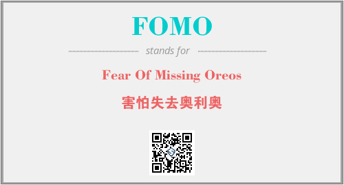 上述内容是“Fear Of Missing Oreos”作为“FOMO”的缩写,解释为“害怕失去奥利奥”时的信息,以及英文缩略词FOMO所代表的英文单词,其对应的中文拼音、详细解释以及在英文中的流行度和相关分类、应用领域及应用示例等。