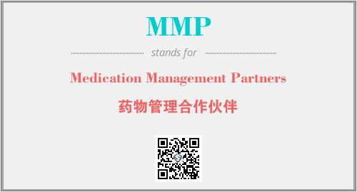 上述内容是“Medication Management Partners”作为“MMP”的缩写,解释为“药物管理合作伙伴”时的信息,以及英文缩略词MMP所代表的英文单词,其对应的中文拼音、详细解释以及在英文中的流行度和相关分类、应用领域及应用示例等。
