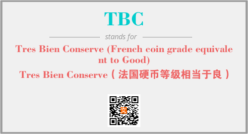英文缩略词“TBC”经常作为“Tres Bien Conserve (French coin grade equivalent to Good)”的英文缩写来使用,中文表示:“Tres Bien Conserve(法国硬币等级相当于良)”。本文将详细介绍英文缩写词TBC所代表英文单词,其对应的中文拼音、详细解释以及在英语中的流行度。此外,还有关于缩略词TBC的分类、应用领域及相关应用示例等。