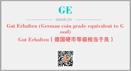 英文缩略词“GE”经常作为“Gut Erhalten (German coin grade equivalent to Good)”的英文缩写来使用,中文表示:“Gut Erhalten(德国硬币等级相当于良)”。本文将详细介绍英文缩写词GE所代表英文单词,其对应的中文拼音、详细解释以及在英语中的流行度。此外,还有关于缩略词GE的分类、应用领域及相关应用示例等。