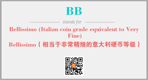 英文缩略词“BB”经常作为“Bellissimo (Italian coin grade equivalent to Very Fine)”的英文缩写来使用,中文表示:“Bellissimo(相当于非常精细的意大利硬币等级)”。本文将详细介绍英文缩写词BB所代表英文单词,其对应的中文拼音、详细解释以及在英语中的流行度。此外,还有关于缩略词BB的分类、应用领域及相关应用示例等。