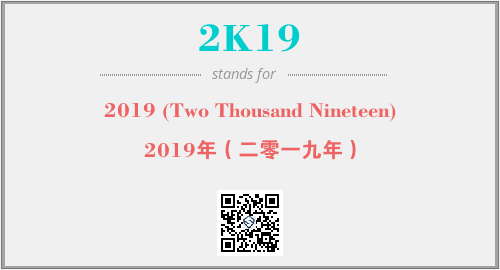 英文缩略词“2K19”经常作为“2019 (Two Thousand Nineteen)”的英文缩写来使用,中文表示:“2019年(二零一九年)”。本文将详细介绍英文缩写词2K19所代表英文单词,其对应的中文拼音、详细解释以及在英语中的流行度。此外,还有关于缩略词2K19的分类、应用领域及相关应用示例等。