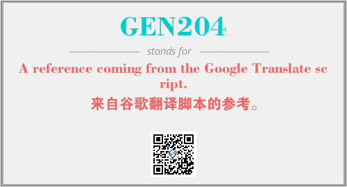 上述内容是“A reference coming from the Google Translate script.”作为“GEN204”的缩写,解释为“来自谷歌翻译脚本的参考。”时的信息,以及英文缩略词GEN204所代表的英文单词,其对应的中文拼音、详细解释以及在英文中的流行度和相关分类、应用领域及应用示例等。
