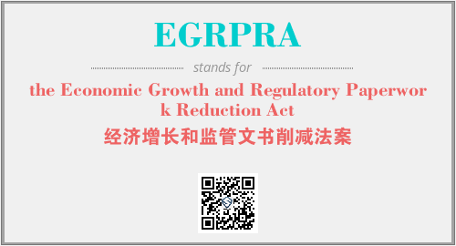英文缩略词“EGRPRA”经常作为“the Economic Growth and Regulatory Paperwork Reduction Act”的英文缩写来使用,中文表示:“经济增长和监管文书削减法案”。本文将详细介绍英文缩写词EGRPRA所代表英文单词,其对应的中文拼音、详细解释以及在英语中的流行度。此外,还有关于缩略词EGRPRA的分类、应用领域及相关应用示例等。