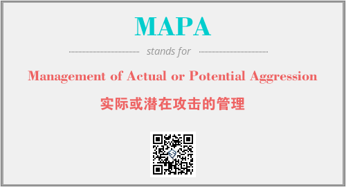 上述内容是“Management of Actual or Potential Aggression”作为“MAPA”的缩写,解释为“实际或潜在攻击的管理”时的信息,以及英文缩略词MAPA所代表的英文单词,其对应的中文拼音、详细解释以及在英文中的流行度和相关分类、应用领域及应用示例等。