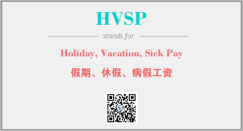 上述内容是“Holiday, Vacation, Sick Pay”作为“HVSP”的缩写,解释为“假期、休假、病假工资”时的信息,以及英文缩略词HVSP所代表的英文单词,其对应的中文拼音、详细解释以及在英文中的流行度和相关分类、应用领域及应用示例等。